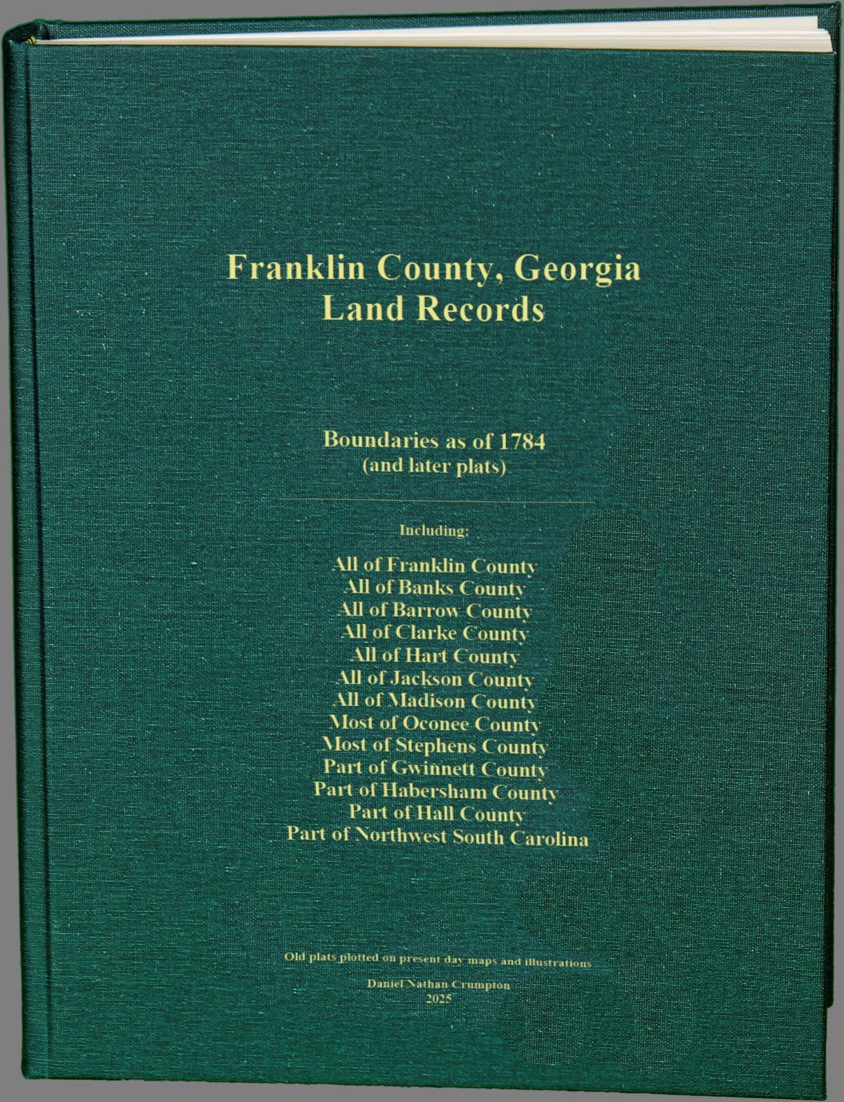 SHIPMENT NOW! Published in 2025. 600+ pages. Abstracts of 3,799 old Franklin County plats. This is the only book to date in Georgia that has ever indexed all the adjoining landowners Green hardbound, price: $75.00 plus $10.00